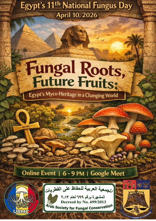 The Arab Society for Fungal Conservation (Botany and Microbiology Department, Faculty of Science, University of Suez Canal at Ismailia), the University of Bucharest (Romania), the Mycology Club at the university of Bucharest, the Convention on Biological Diversity (CBD) and the Mohamed bin Zayed Species Conservation Fund (MBZ) announce the 11th anniversary celebration of the National Fungus Day of Egypt. The celebration will take place on the 10th of April 2026 from 18:00 till 21:00 (Romania time) if Allah wills. Join us by Google Meet.